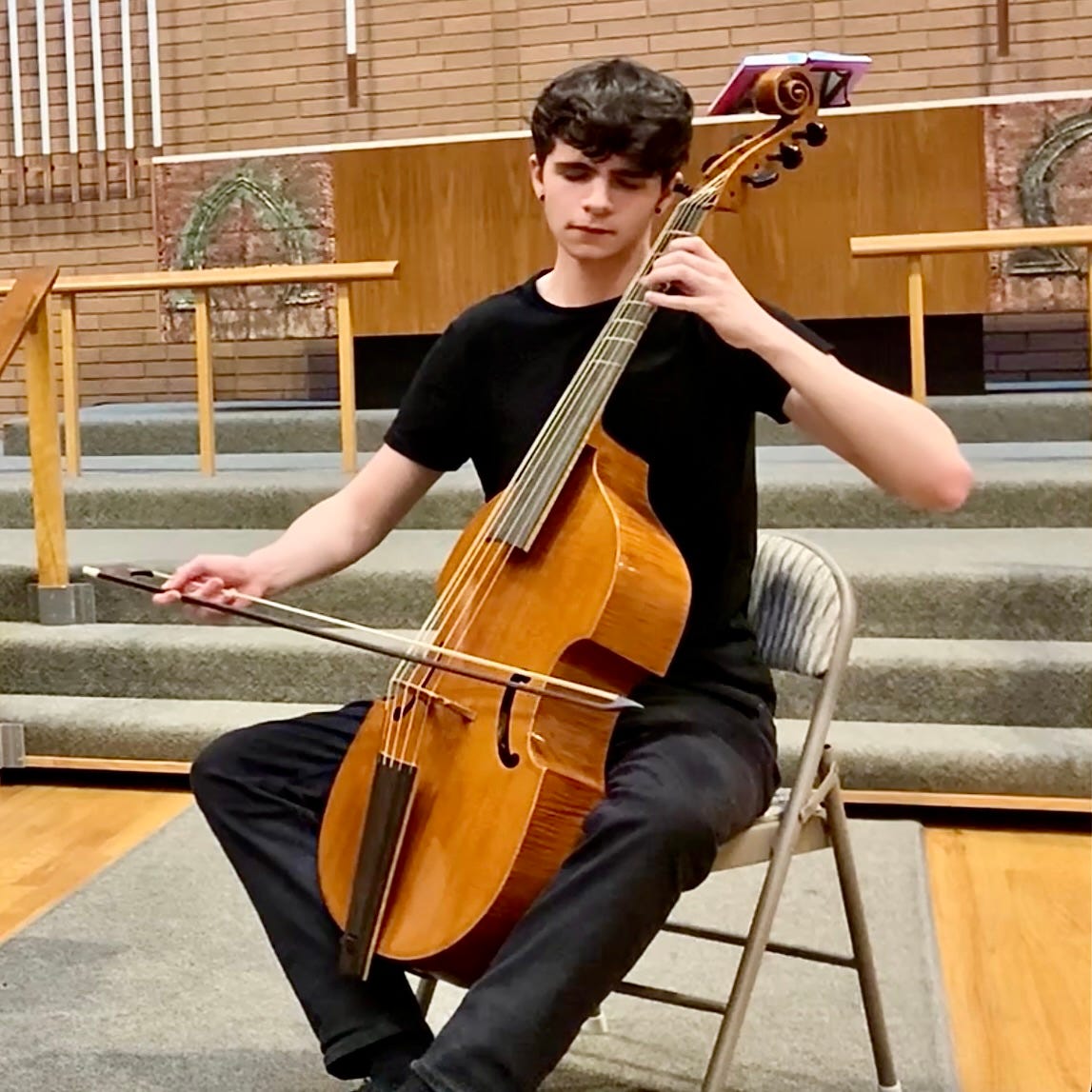 Although this student enjoys the historical repertoire that comes with the viol, he doesn’t want to be limited to it. In the spring he composed this ravishing tango. I can take no credit whatsoever; he honed his ear and his compositional skill in other areas of his musical life. But I was delighted and grateful that our lessons had turned out to be a hospitable space for him to follow some of his own ideas and desires. I didn’t yet know how to imagine that possibility in our initial violin years. I was focused on doing what I always did: trying in more and less creative ways to move a little kid through my agendas about beginner technique and practice habits. Having been through that rodeo many times, I feel confident saying that a great majority of students do seem to benefit from front-loading those foundational skills, even when it takes a lot of time and patience. But it’s clearer to me now that most doesn’t mean all, and that a student’s own ideas and direction might turn out to be more marvelous than anything I could have envisioned.